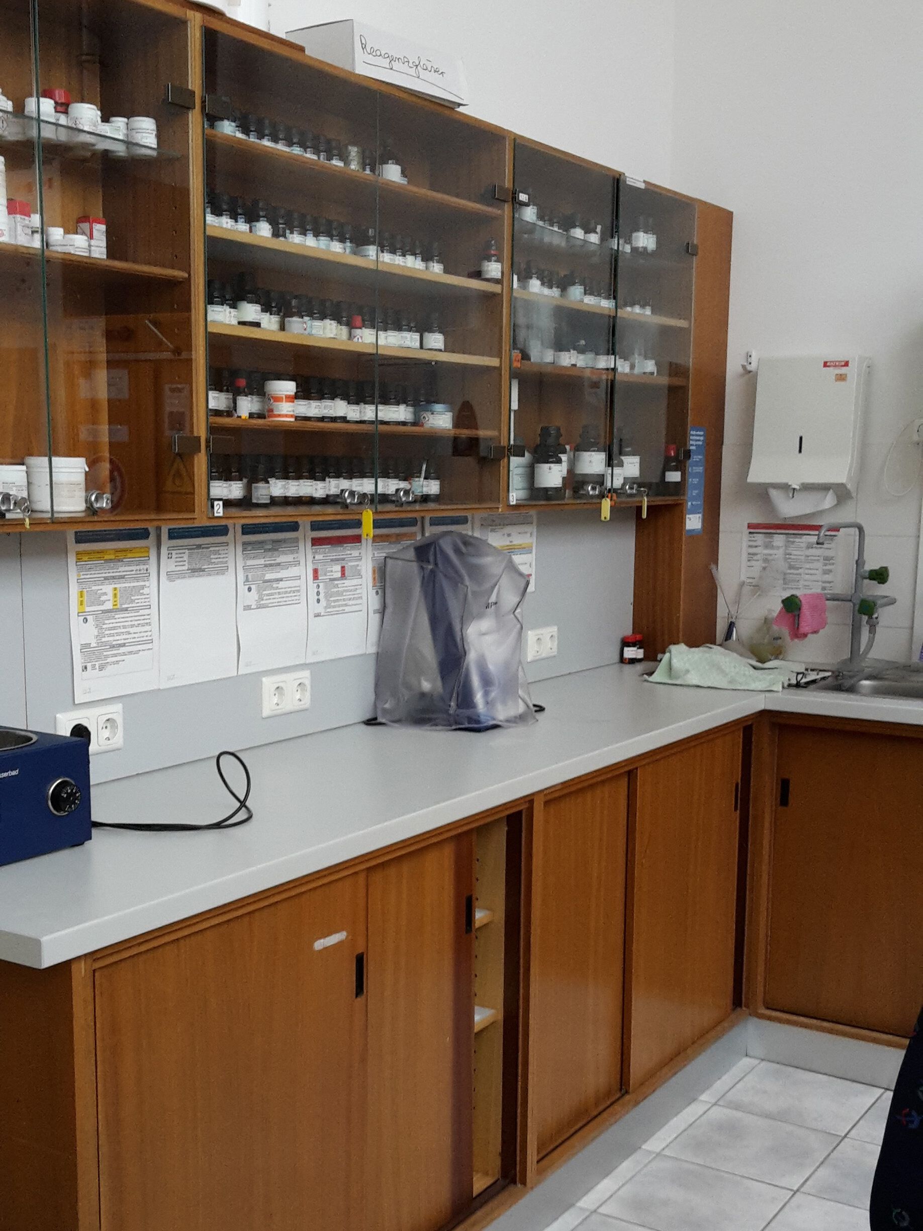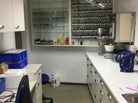 Eine Laboreinrichtung und Rezeptur mit diversen Geräten, Laborartikeln und Glasgeräten stehen ebenfalls zum Verkauf.